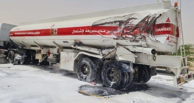 هذا وقد تمت السيطرة على التسرب وتأمين الموقع لحين إزالة الشاحنتين عن الطريق.