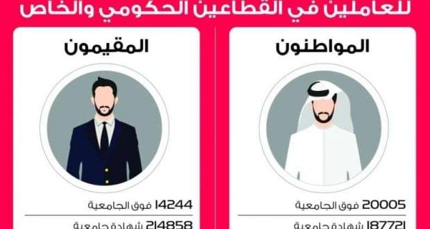 أما بالنسبة للمواطنين، فأظهرت الأرقام أن عددهم في القطاعين الحكومي والخاص يبلغ 434825، غالبيتهم جامعيون.