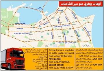 أعلنت وزارة الداخلية منع سير الشاحنات على الطرقات العامة من يوم الاحد إلى يوم الخميس من كل أسبوع على فترتين ، الأولى من الساعة السادسة والنصف صباحاً حتى الساعة التاسعة صباحاً ، والفترة الثانية تبدأ من الساعة الثانية عشر والنصف ظهراً حتى الساعة الثالثة والنصف عصراً .