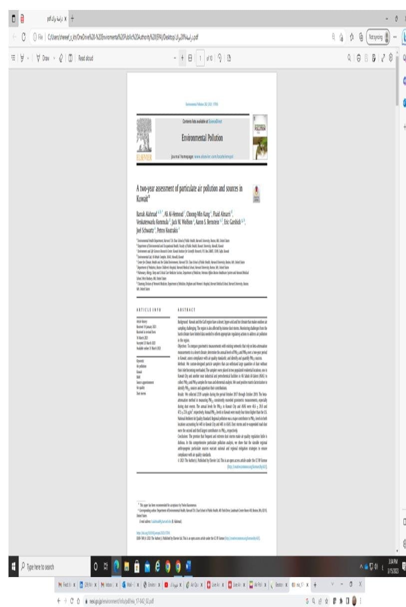 9- إن أحدث دراسة لظاهرة الغبار بدولة الكريت وتحليل محتواه من المعادن النزرة و مصادرها كانت قد اجريت من قبل كلية هارفرد للصحة العامة وكان الباحث الرئيسي الدكتور / براك الاحمد من دولة الكويت، حيث تم جمع عدد 2339 عينة من الغبار و الجسيمات الدقيقة القابلة للاستنشاق (PM10 و PM2.5) من هواء مدينة الكويت ومنطقة علي صباح السالم (ام الهيمان) خلال عامي 2017 الى 2019 وتم تحليلها بمختبرات كلية هارفرد بالولايات المتحدة الامريكية(مرفق جدول من نتائج التحليل)، حيث أثبتت تلك النتائج بأن تراكيز المعادن النزرة في عينات الغبار القابل للاستنشاق كانت ضمن الحدود الطبيعية وهذه النتائج تناقض ما تدعي به جماعة الخط الاخضر نقلا عن دراسة تم نشرها عن طريق صحيفة محلية غير متخصصة بعلم البيئة، علما بأن دراسة كلية هارفارد للصحة العامة تم تحكيمها ونشرها في احد الدوريات العلمية المعتمدةELSEVEIR في عام 2021 (مرفق).