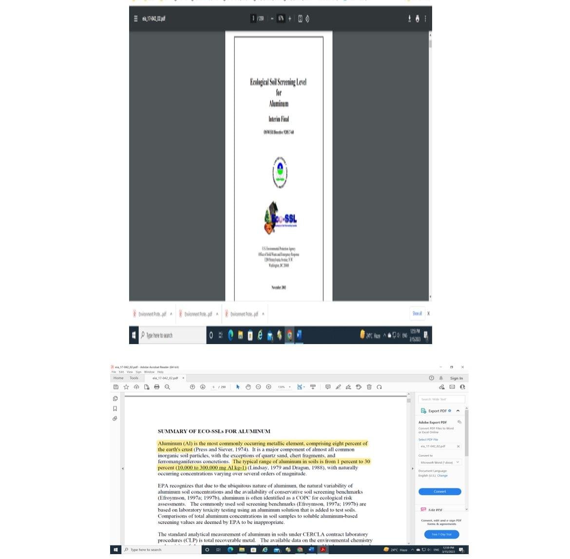 5- من خلال قراءة ما بين السطور تحت العنوان العريض “السموم الموجودة في غبار الكويت” في خبر الخط الأخضر نقلاً عن صحيفة USA Today نقرأ “أوضح لايلز أن من بين العناصر ال 37 التي تم اكتشافها في غبار صحراء الكويت العناصر التالية:………الألمنيوم : بواقع 7,521 جزيء في المليون والتي تسبب …. ولها علاقة بمرض الزهايمر و أمراض….”. يجدر التنويه على سبيل المثال و ليس العصر إلى أن هذا التركيز من عنصر الألمنيوم (Aluminum, Al) بهذه الواحدة (جزء في المليون parts per million, ppm = mg/kg) في غبار صحراء دولة الكويت هو موجود بشكل طبيعي في التربة وقشرة الأرض حيث تشير المراجع العلمية أن تركيز عنصر الألمنيوم في التربة يتراوح بين 10,000 الى 300,000 جزء في المليون ( parts per million, ppm = mg/kg)- (مرفق دراسة وكالة حماية البيئة الأمريكية عن الألمنيوم في التربة 2003).