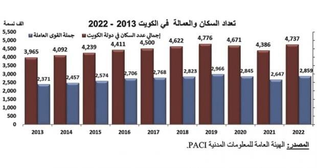 ذكر تقرير الشال الأسبوعي أن الهيئة العامة للمعلومات المدنية أصدرت آخر البيانات التفصيلية عن إحصاءات السكان والعمالة في نهاية ديسمبر 2022، ولم تصدر البيانات التفصيلية لنهاية عام 2021، وتوضح أن عدد السكان الإجمالي بالكويت بلغ في ديسمبر 2022 نحو 4.737 ملايين نسمة.