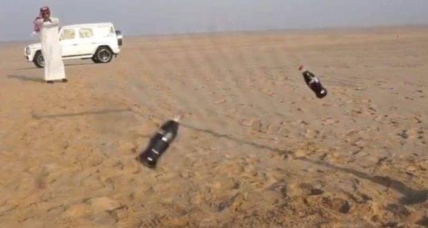 وأظهر الفيديو سعيد المري وهو يقوم بربط زجاجتي مياه غازية ” كوكاكولا” ، ب “حبلين” وعلقهما على خشبة مثبتة على الأرض في منطقة صحراوية، وقام بتحريكهما.