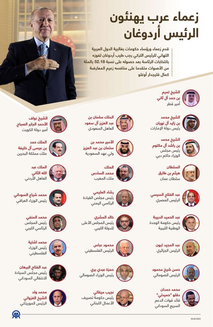 نشرت وكالة “الأناضول” التركية، صورة لزعماء ورؤساء حكومات الدول العربية، الذين قدموا التهاني للرئيس التركي رجب طيب أردوغان لفوزه بانتخابات الرئاسة، وقد برز غياب رئيسين عنها فمن هما؟