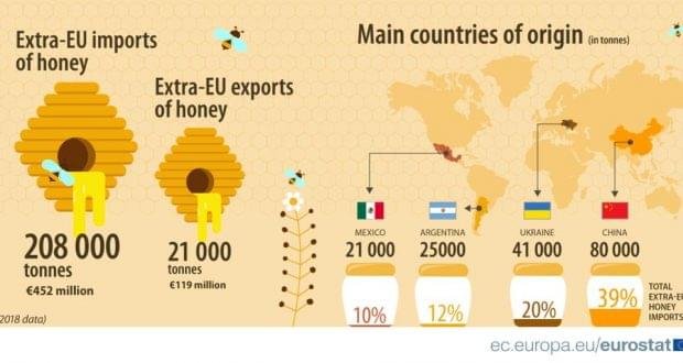 الجدير بالذكر، أنه في عام 2018 استوردت دول الاتحاد الاوربي ٢٠٨ آلاف طن من العسل وصدرت ٢١ ألف طن من العسل، وكانت المانيا أكبر مستورد للعسل بالاتحاد الأوربي ٢٩٪ ثم بريطانيا ٢١٪ تليها بلجيكا 11% ثم بولندا 10% ثم اسبانيا 8%، أما عام 2022 اصبحت بريطانيا أكبر مستورد للعسل تليها سويسرا.