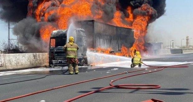 قوة الإطفاء العام: لا شبهة جنائية في حريق شاحنة تنقل مادة (المذيب الأبيض) على طريق جسر الغزالي