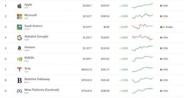وفي المركز الثاني جاءت شركة مايكروسوفت الأميركية لتعزز مكانتها كثاني أكبر شركة في العالم بقيمة سوقية تبلغ نحو 2.53 تريليون دولار، بعد أن أغلق سهم الشركة بنهاية الأسبوع الماضي عند مستوى 340.54 دولارا للسهم الواحد، فيما جاءت بالمركز الثالث عملاق النفط شركة أرامكو السعودية بقيمة سوقية تبلغ 2.08 تريليون دولار، حيث ارتفع سهم الشركة بنسبة 0.16% ليبلغ مستوى 8.6 دولارات للسهم الواحد بنهاية تعاملات الأسبوع.