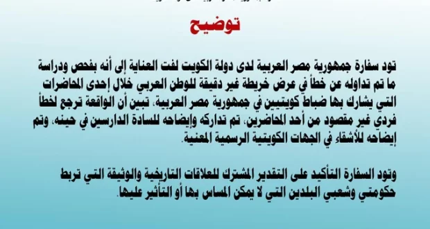 أوضحت سفارة جمهورية مصر العربية لدى دولة الكويت أنه بفحص ودراسة ما تم تداوله عن خطأ في عرض خريطة غير دقيقة للوطن العربي خلال إحدى المحاضرات التي يشارك بها ضباط كويتيون في جمهورية مصر العربية تبين أن الواقعة ترجع إلى خطأ فردي غير مقصود من أحد المحاضرين، تم تداركه وإيضاحه للدارسين في حينه، وتم إيضاحه للأشقاء في الجهات الكويتية الرسمية المعنية.