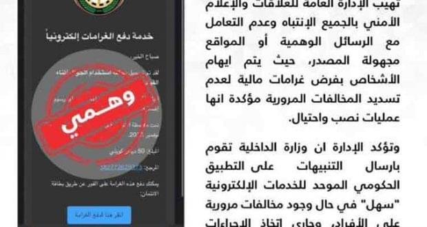 اهابت الإدارة العامة للعلاقات والإعلام الأمني بالجميع الانتباه وعدم التعامل مع الرسائل الوهمية أو المواقع مجهولة المصدر، حيث يتم ايهام الأشخاص بفرض غرامات مالية لعدم تسديد المخالفات المرورية مؤكدة انها عمليات نصب واحتيال.
