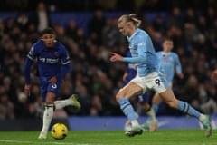 وكاد هالاند أن يتعادل لمان سيتي في الدقيقة 42 بعد أن وصلته تمريرة من بيرناردو سيلفا وسدد كرة خطيرة من داخل منطقة الجزاء تألق الحارس روبيرت سانشيز في التصدي لها.