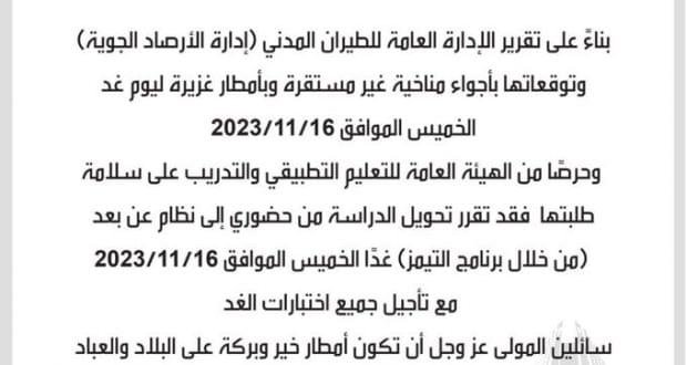 وجاء القرار بناء على تقرير الإدارة العامة للطيران المدني “إدارة الأرصاد الجوية” وتوقعاتها بأجواء مناخية غير مستقرة وبأمطار غزيرة هذا اليوم.