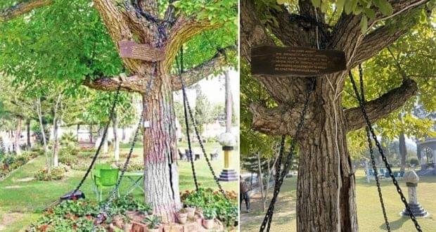 شجرة بانيان الموجودة في معسكر لاندي كوتال للجيش في باكستان ظلت محتجزة لسنوات، وتعرض لوحة مكتوب عليها “أنا رهن الاعتقال”.