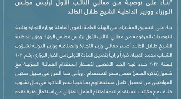 قالت وزارة التجارة والصناعة انه بناء على توصية من النائب الأول لرئيس مجلس الوزراء ووزير الداخلية الشيخ طلال الخالد، وبناء على التنسيق المشترك بين الهيئة العامة للقوى العاملة ووزارة التجارة، أصدر وزير التجارة والصناعة ووزير الدولة لشؤون الشباب محمد العيبـان قـراراً وزارياً بتعديل المادة الأولى من القرار الوزاري رقم 103 لسنة 2022 حدد فيه الحد الأقصى لأسعار استقدام العمالة المنزلية مع شمول (تذكرة السفر) ضمن سعر الاستقدام، ويأتي هذا القرار في سبيل تمكين المواطنين من تحصيل كامل مستحقاتهم بما فيها سعر التذكرة في حال نشوب خلاف مع مكتب الاستقدام نتيجة امتناع العامل المنزلي عن استكمال فترة عقده مع رب العمل .