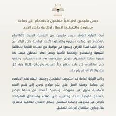 كما أفصحت النيابة عن أنها أمرت بحبس مواطنين احتياطياً لاتهامهما بالانضمام إلى ذات الجماعة المحظورة «داعش»، إذ استقبل المتهم الأول اثنين من جنسية خليجية- في منزله يتبعان تلك الجماعة، ويسر لهما طريق السفر إلى دول أجنبية يقيم فيها أعضاؤها حتى يشاركا في صفوف مقاتليها، وأبدى المتهم عزمه على المشاركة معهم في القتال إلا أنه لم يتمكن من ذلك، وقام بتحويل مبالغ مالية لأعضائها عوناً لهم، وأَرشَدَ المتهم الثاني إلى قنوات في وسائل التواصل الاجتماعي تمكن فيها الأخير من مراسلة قيادات تلك الجماعة التي حثته على القيام بأعمال إرهابية داخل البلاد، وسعى في دراسة طرق صناعة المتفجرات ونشر أبحاث فيها، واشترى إحدى المواد الكيميائية الأساسية المستخدمة في صناعة العبوات الناسفة بهدف تفجير أحد المعسكرات التابعة لوزارة الداخلية.