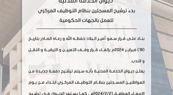 بناء على قرار سمو أمير البلاد حفظه الله ورعاه الصادر بتاريخ 18 فبراير 2024 بإلغاء قرار وقف التعيين والترقية والنقل والندب، يعلن ديوان الخدمة المدنية أنه سيتم ترشيح دفعة جديدة من المواطنين المسجلين بنظام التوظيف المركزي ابتداء من يوم غد الأربعاء الموافق 21/2/2024، كما يستمر الديوان في ترشيح أعداد اخرى من المسجلين خلال الأيام القادمة.