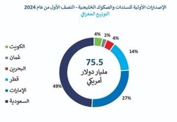 وتصدرت السعودية القائمة خليجيا من حيث إجمالي قيمة الإصدارات الأولية للسندات والصكوك بالنصف الأول من 2024، حيث بلغت بقيمة إجمالية 37 مليار دولار من خلال 44 إصدارا، وهو ما يمثل 49% من الإجمالي.