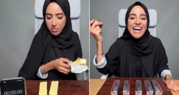 وثقت “التيك توكر” السعودية رنا مطر فيديو جديد تتحدى فيه المشاهدين بتناول 5 قوالب زبدة أمام الكاميرا، في مشهد صادم أثار دهشة المتابعين.