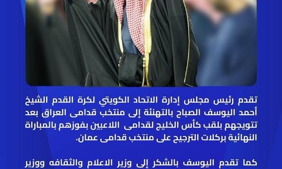 تقدم رئيس اتحاد كرة القدم الشيخ أحمد اليوسف الصباح بالتهنئة إلى منتخب قدامى العراق بعد تتويجهم بلقب كأس الخليج لقدامى اللاعبين بفوزهم بالمباراة النهائية بركلات الترجيح على منتخب قدامى عمان.