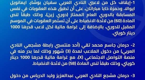 ٢- حرمان جاسم محمد تقي (أحد منتسبي رابطة مشجعي النادي العربي) من دخول الملاعب لمدة (3) شهور وذلك لما بدر منه في منصة التواصل الاجتماعي (X)، مع غرامة مالية قدرها 1000 دينار كويتي، وذلك طبقاً لنص المادة (58) من لائحة الانضباط.