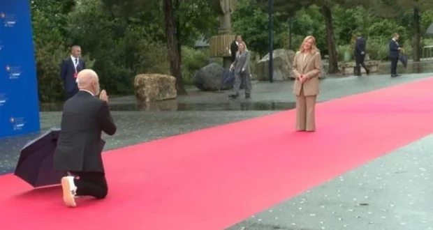 ووثق المقطع الذي تداولته عدة وسائل إعلام عالمية، لحظة وصول ميلوني على السجادة الحمراء، إذ وضع راما مظلته جانباً وانحنى على ركبة واحدة، وضمّ يديه في تحية “ناماستي” ترحيبية.