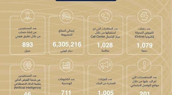 كشف بنك الائتمان أن إجمالي مصروفاته خلال الأسبوع الماضي بلغ 6 ملايين و305 آلاف و216 دينارا، بينما تم تحويل قروض بواقع ألف و79 دفعة عبر «الأونلاين».