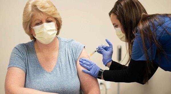 RN Clinical Staff Educator Diane Mikelsons receives a mock Pfizer vaccine for the coronavirus disease (COVID-19) during a staff vaccine training session at UW Health in Madison, Wisconsin, U.S., December 8, 2020. Picture taken December 8, 2020. John Maniaci/UW health/Handout via REUTERS NO RESALES. NO ARCHIVES. THIS IMAGE HAS BEEN SUPPLIED BY A THIRD PARTY.