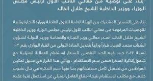قالت وزارة التجارة والصناعة انه بناء على توصية من النائب الأول لرئيس ...